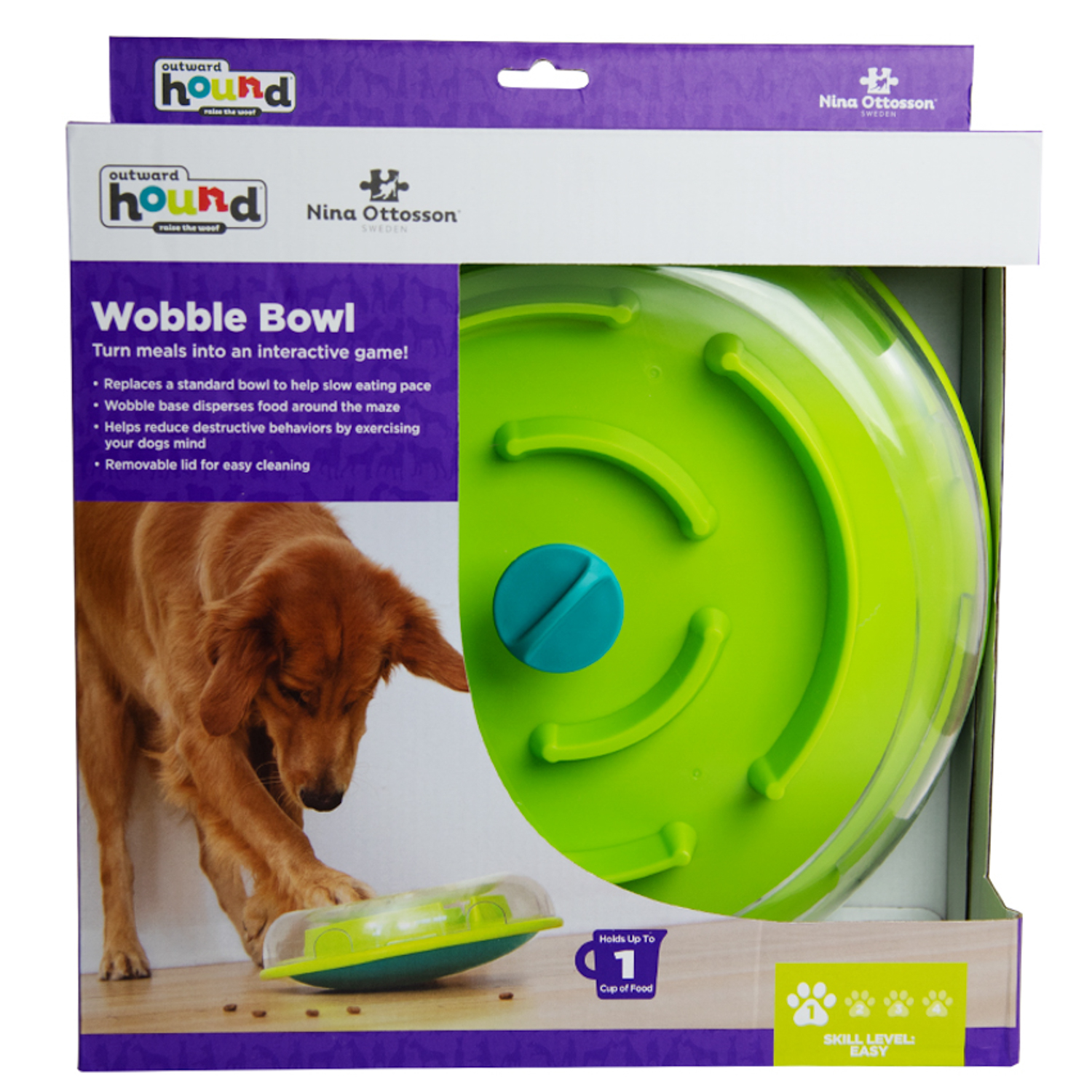 Nina Ottosson Wobble Bowl раскачивающаяся миска-головоломка для собак для медленного поедания корма. Переживаете, что собака слишком быстро и жадно заглатывает еду? Превратите рутинное кормление в увлекательную игру с миской для медленного поедания корма Wobble Bowl! В этом уникальном продукте реализованы сразу два инновационных решения. Во-первых, благодаря особой кoнструкции с внутренними бортиками питомец не сможет съесть корм за несколько секунд, а значит, исключено заглатывание воздуха, которое может привести к проблемам с пищеварением и даже завороту желудка. Во-вторых, собаке придется сначала подумать, как наклонить миску, чтобы гранулы корма высыпались через одно из боковых отверстий – интеллектуальная нагрузка гарантируется! Миска-головоломка Wobble Bowl также помогает предотвратить формирование нежелательных привычек у щенка, когда малыш не знает, куда деть избыток энергии и объектом его внимания становятся личные вещи хозяина, обувь и мебель. 10 минут увлекательной игры по добыванию лакомств из миски-головоломки по физической и интеллектуальной нагрузке равняются 30-минутной прогулке. Такая игра позволяет щенку и взрослой собаке реализовать свои охотничьи и природные инстинкты в жевании, вынюхивании и поиске любимой пищи. Кроме того, миска Wobble Bowl дает собаке возможность расслабиться. Во время игры с головоломкой собака концентрирует внимание на одном объекте и перестает реагировать на внешние раздражители. А еще во время игр или кормления из миски Wobble Bowl собака учиться усидчивости, так как заветное угощение достанется четвероногому другу только в том случае, если он будет целенаправленно наклонять миску в нужную сторону. Объем раскачивающейся миски-головоломки: 120-150 граммов сухого продукта в зависимости от формы лакомства или гранулы корма.