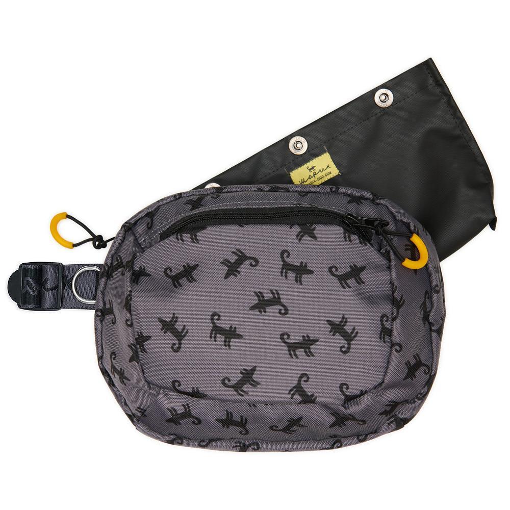Удобная поясная сумка для лакомств с нашим авторским принтом ♥ Главная фишка сумки – вкладыш для собачьих лакомств, который может находиться как в основном отделении сумки, так и во внешнем кармашке. Для закрепления вкладыша и там, и там предусмотрены кнопки. Вкладыш удобно вынуть и постирать в машинке или просто ополоснуть водой, чтобы избавиться от остатков еды. Вы можете вытащить его совсем и использовать сумку просто как поясную. Если для поощрения собаки вы используете влажные/жирные лакомства, советуем дополнительно приобрести силиконовый вкладыш. Внешнее отделение можно ещё использовать для, например, телефона или пакетиков для уборки за собакой. В этом же отделении прячется небольшой карабин – на него удобно прицепить ключи или кликер. Сумка и вкладыш сшиты из ткани c водоотталкивающей пропиткой. Размеры сумки: 25 х 22 см Обхват ремня: 54-120 см