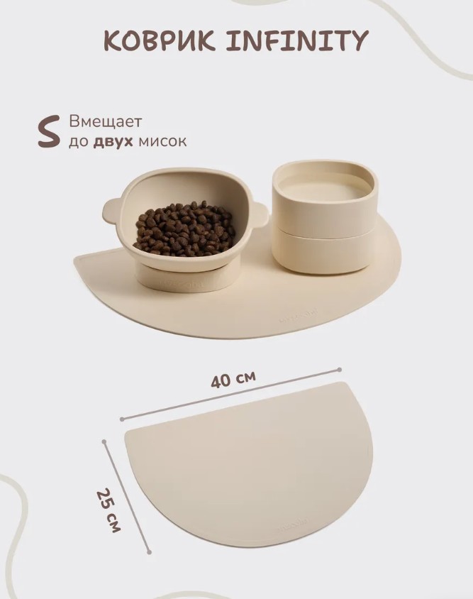 Pet Mat INFINITY. Практичное дополнение к мискам Pet Bowl INFINITY. Коврик из пищевого силикона предназначен для обеспечения чистоты и удобства при кормлении вашего питомца. Изготовленный из высококачественного, безопасного для здоровья пищевого силикона, он идеально подходит для использования с анатомическими мисками. Коврик надежно фиксирует миску на месте, предотвращая её скольжение по полу, что значительно упрощает процесс кормления. Коврик под миску предотвращает разбрасывание крошек или воды, сохраняя пол чистым и упрощая уборку. Эстетичная форма полумесяц дополнит миску INFINITY, а также украсит интерьер. Аккуратный бортик не мешает питомцу свободно подходит к миске и наступать лапками. Коврик предотвращает разбрасывание корма или воды, сохраняя пол чистым и упрощая уборку. Подходит для всех видов мисок для более эстетичного вида в интерьере. Размер S подходит для одного питомца и для расположения двух мисок: 40х25см. Размер M подходит для двух питомцев и для расположения трех мисок: 60х25см.