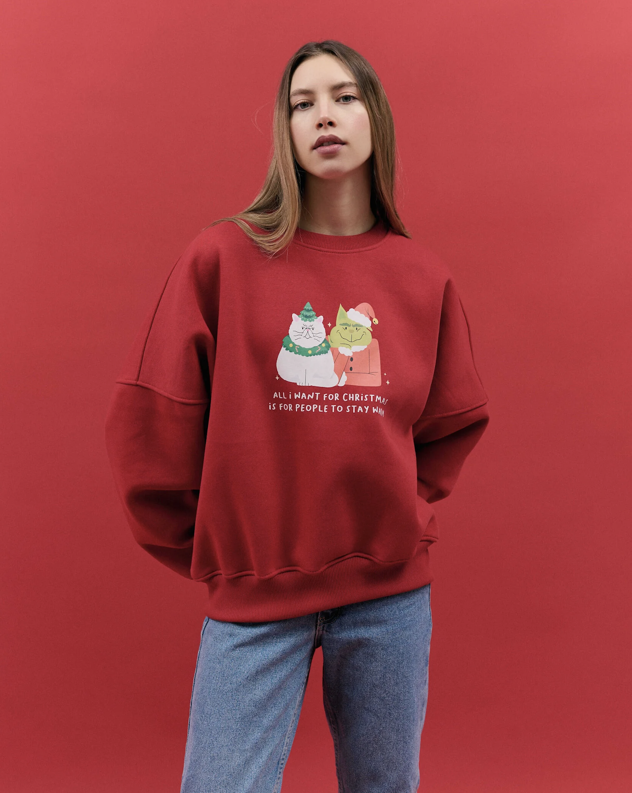 Модель oversize с круглым воротом и надписью на груди, выполненной методом термотрансфер. Свитшот с начесом. Состав: 90% хлопок, 10% полиэстер.