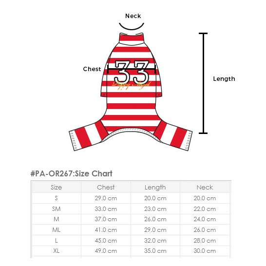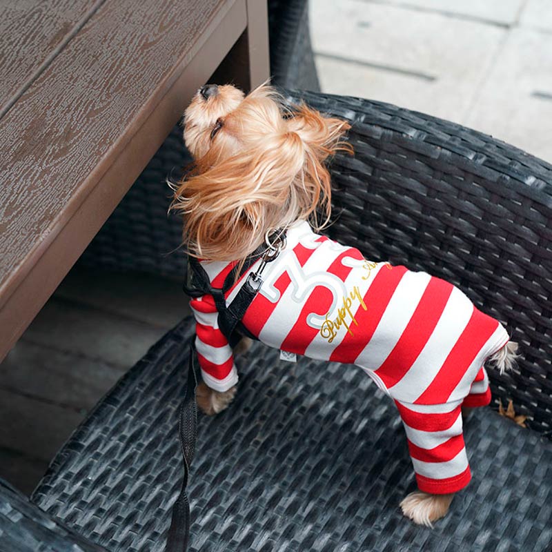 Костюм-унисекс слинг в полоску с апликуцией; Новинка для активных собак; Идеальная посадка; Прекрасно подойдет для собак с длинными лапами; Выполнен из эластичного хлопка в полоску; Воротник - стойка; Спинка украшена фирменной аппликацией 33;