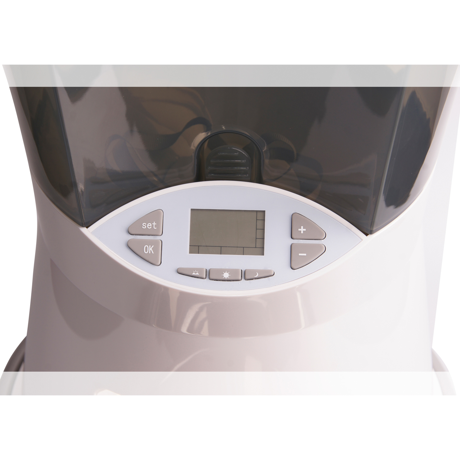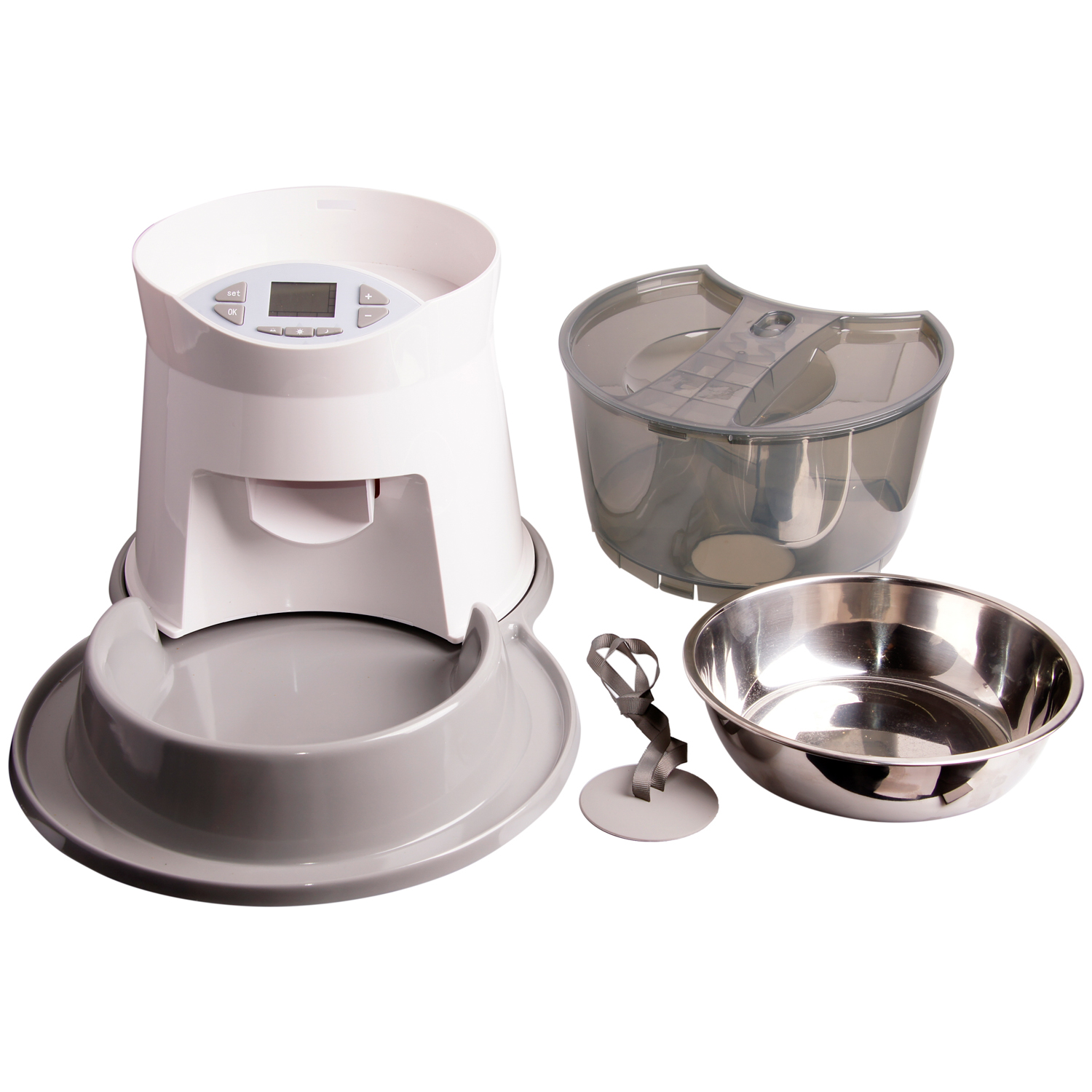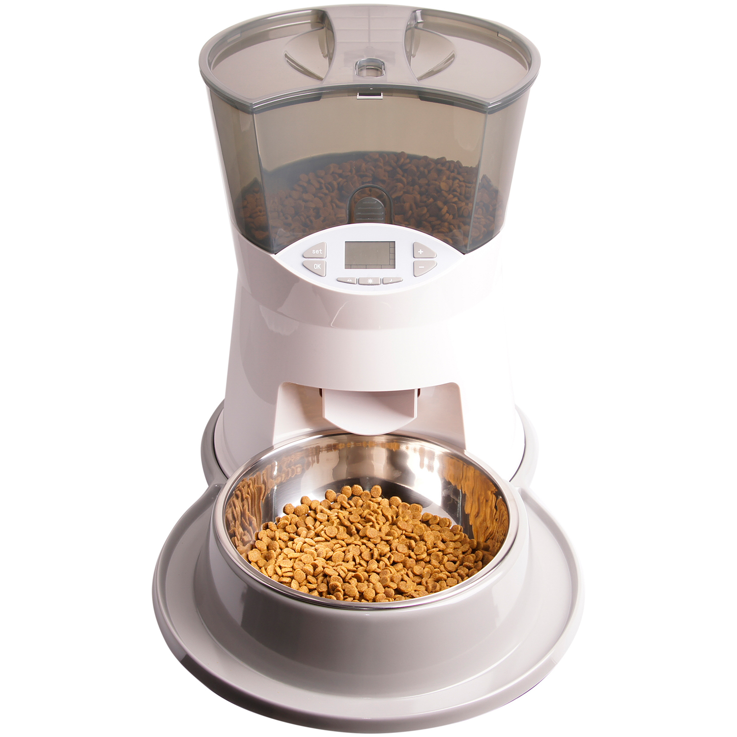 Автоматическая кормушка подходит для кошек и для собак мелких и средних пород. Она может работать от сети или от аккумуляторов. Время работы автокормушки без сети — 5 месяцев при полном заряде аккумуляторов. Эта кормушка поддерживает режим трёхразового кормления: завтрак, обед и ужин. В ней можно регулировать порцию и время подачи. Чтобы настроить правильно кормушку, воспользуйтесь инструкцией. С этой автокормушкой можно не бояться оставлять питомца одного дома, потому что он всегда будет получать свежий корм точно по расписанию. Не рекомендуется для щенков до 3-х месяцев.